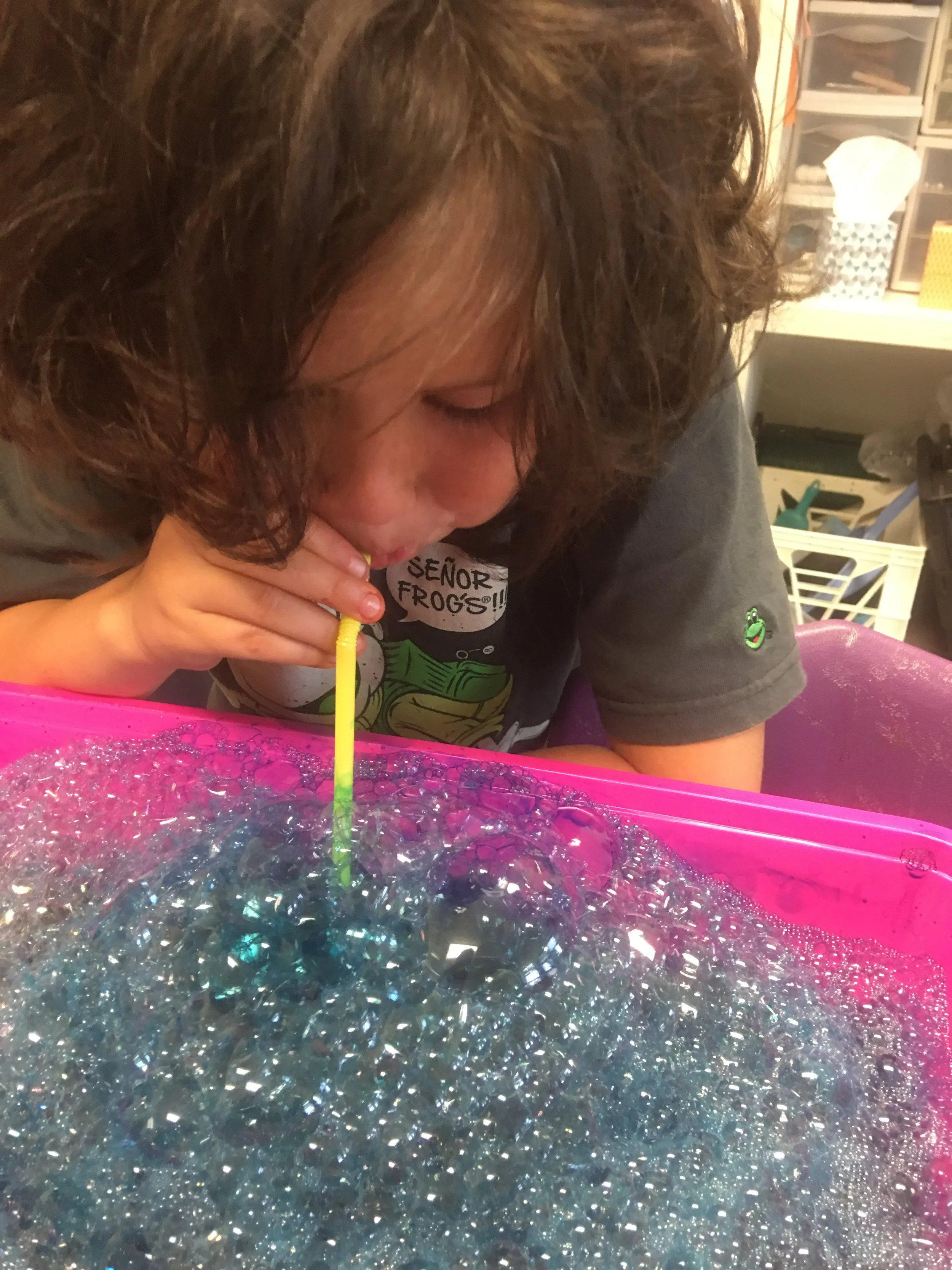 Using dye and soap to blow bubbles to make bubble prints